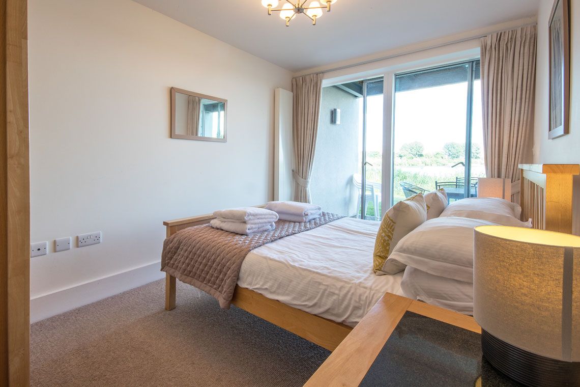 BEDROOM ONE Situated on the ground floor, this double bedroom offers direct access to the deck. Imagine waking to stunning lake views as the sun rises, casting its gentle light over the water. The adjoining en‑suite bathroom features a bath with an overhead shower, a washbasin, and WC. Additional highlights include built‑in wardrobes, carpeted flooring in the bedroom, and tiled flooring in the en‑suite.