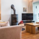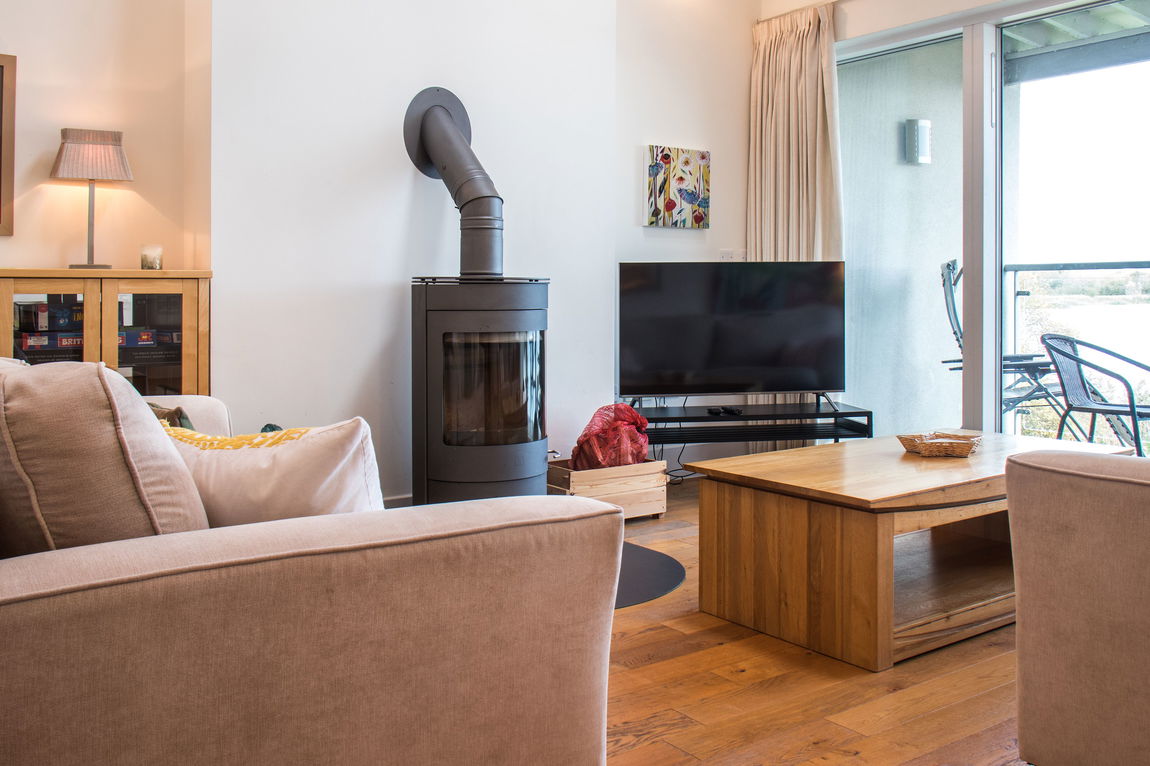 LIVING ROOM/DINING ROOM The living room is the standout feature of the house, boasting high ceilings and floor-to-ceiling glazed windows that frame stunning panoramic lake views. A modern, contemporary wood-burning stove keeps the space cosy on chilly nights, while large sliding glass doors lead to the upper deck—a perfect spot to relax and enjoy the abundant birdlife that calls the lake home all year round.