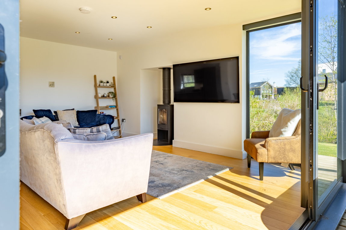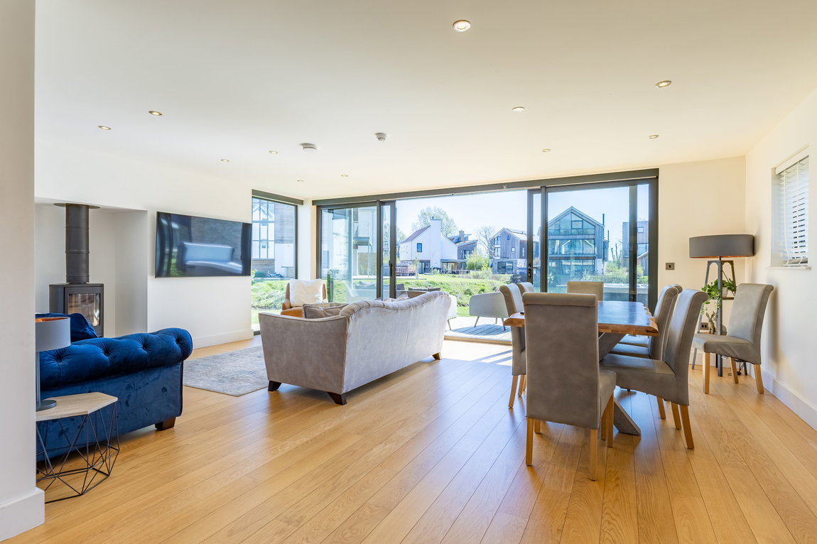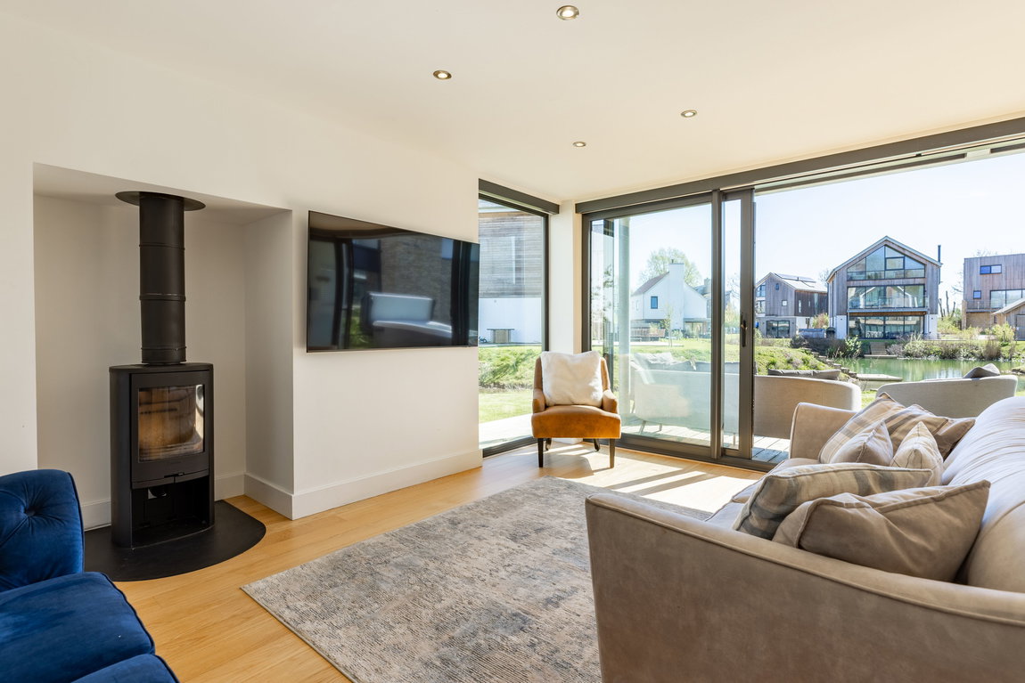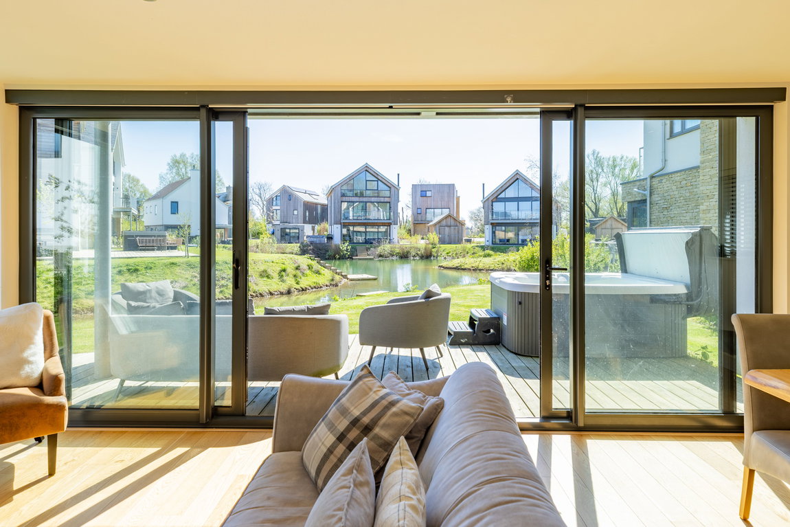 Beyond the hallway, the home opens into a generous open-plan living space, with the kitchen leading through to the dining area and sitting area, complete with a log burner. Large floor-to-ceiling sliding glass doors open onto the ground floor sun deck, which enjoys direct access to Minety Lake.