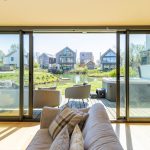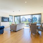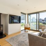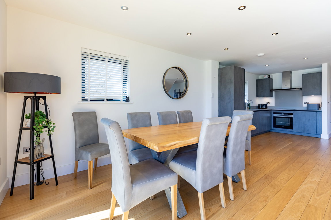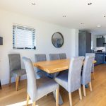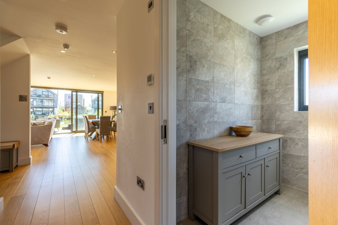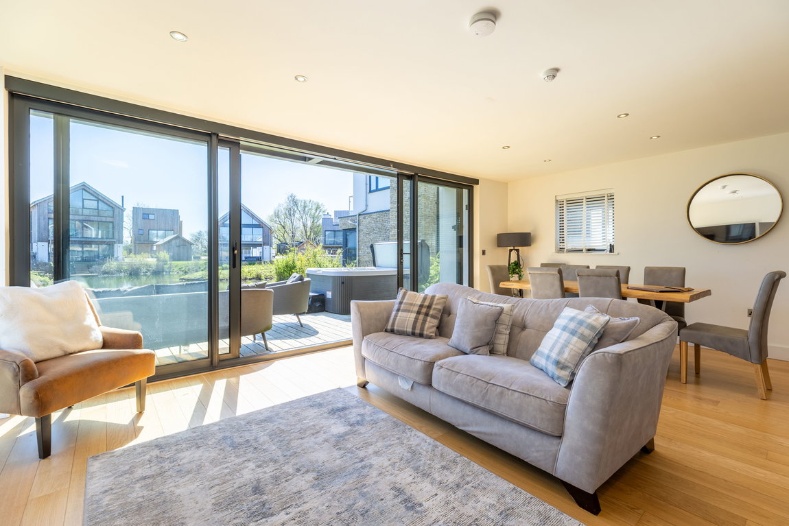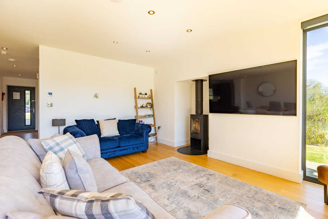 Beyond the hallway, the home opens into a generous open-plan living space, with the kitchen leading through to the dining area and sitting area, complete with a log burner. Large floor-to-ceiling sliding glass doors open onto the ground floor sun deck, which enjoys direct access to Minety Lake.