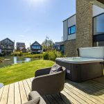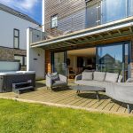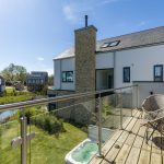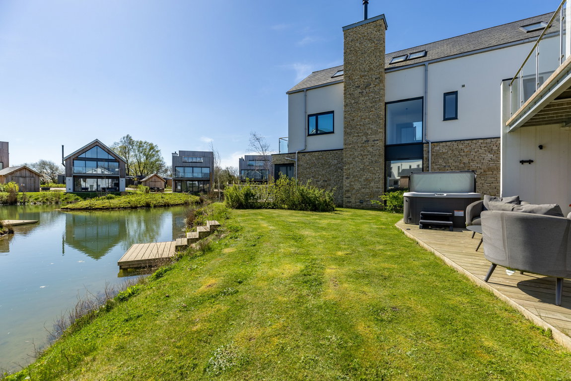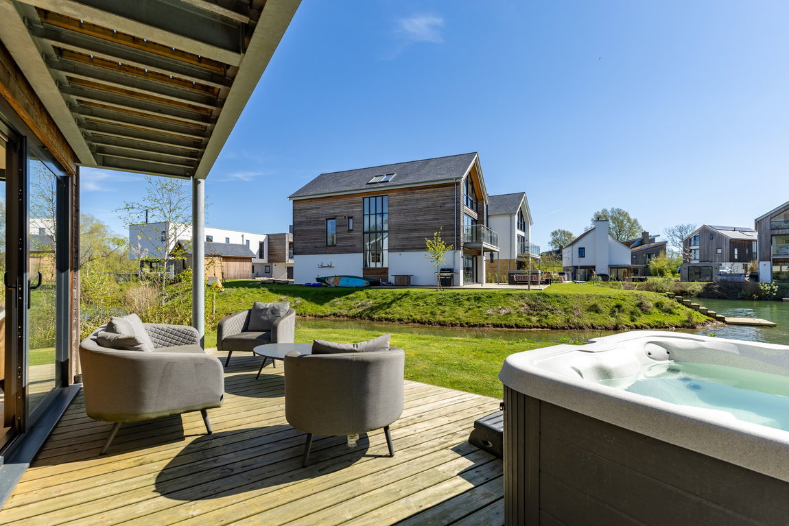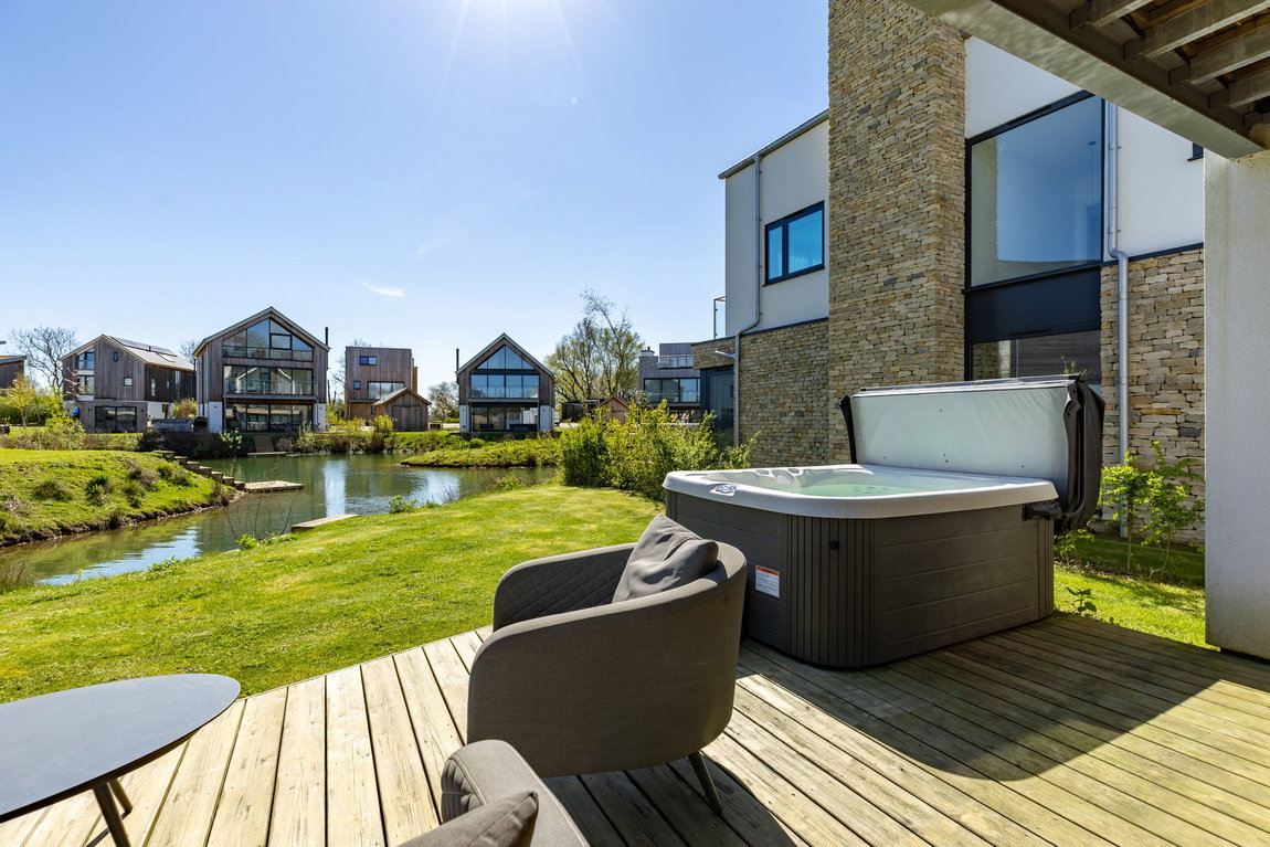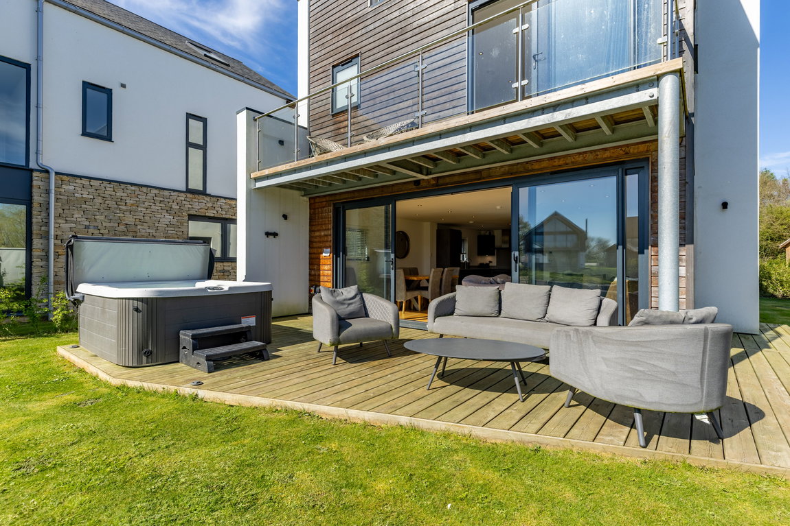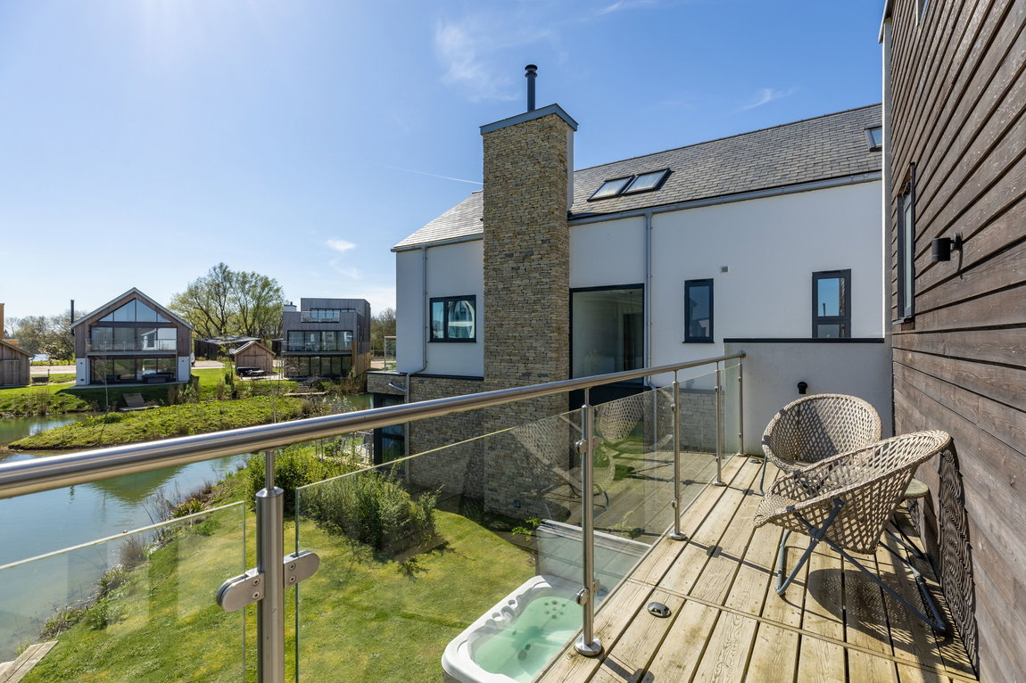Sliding doors provide direct access to the ground floor sun deck, complete with a hot tub and enjoying beautiful views over the lake and surrounding gardens.
