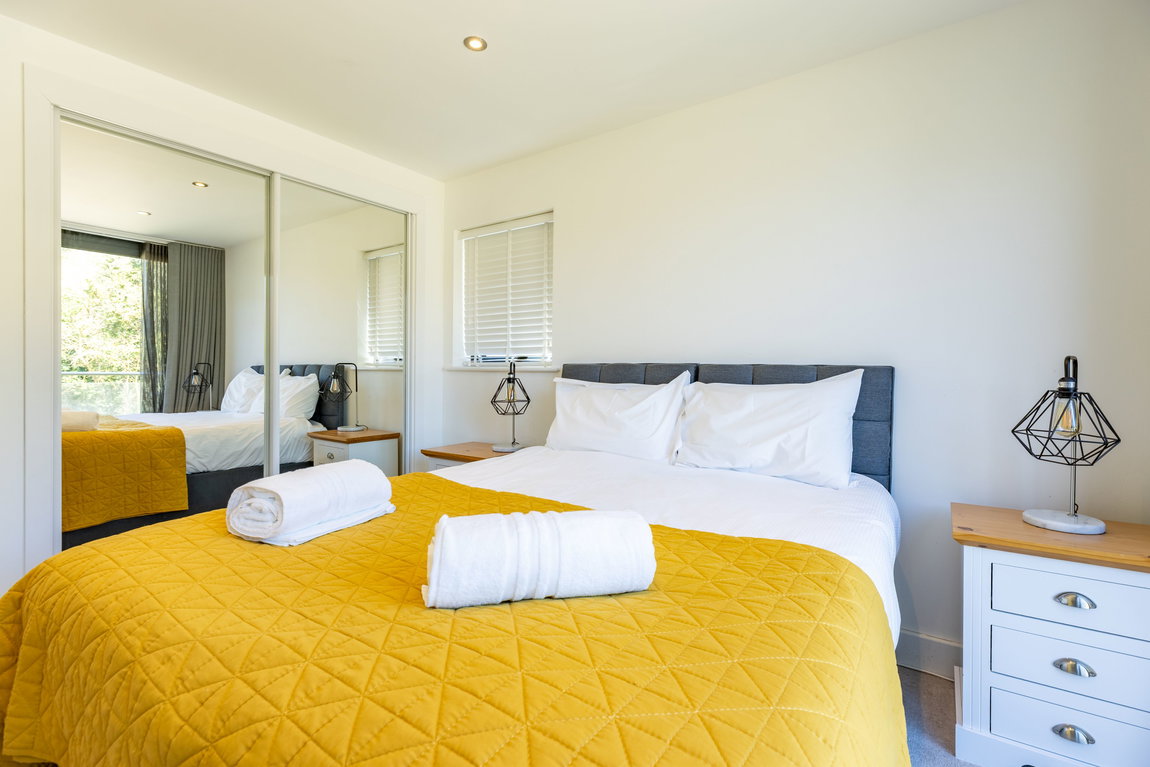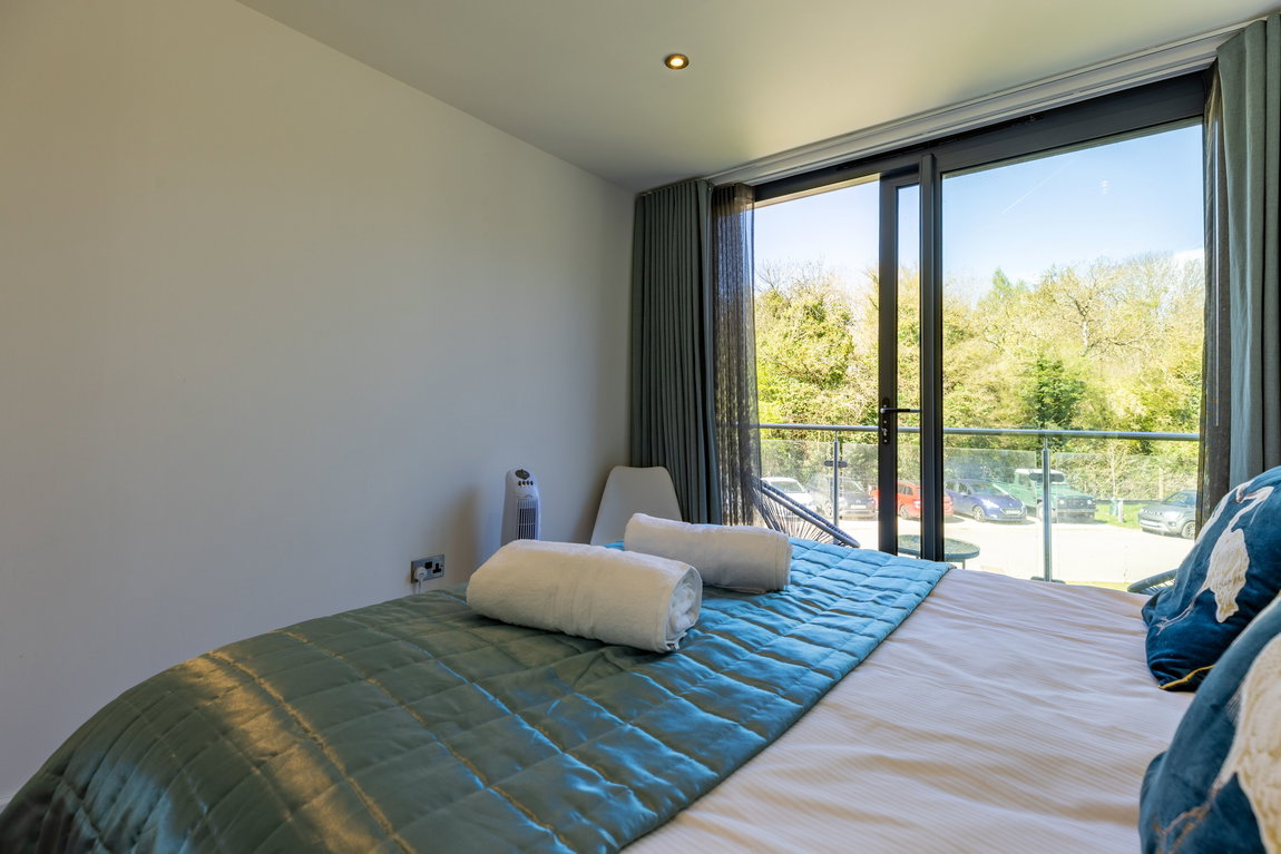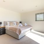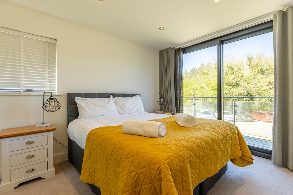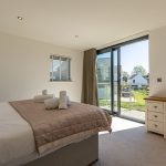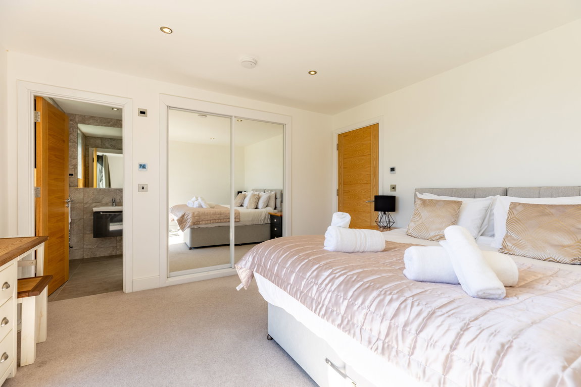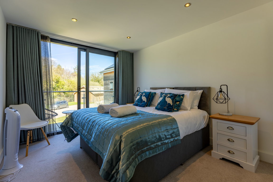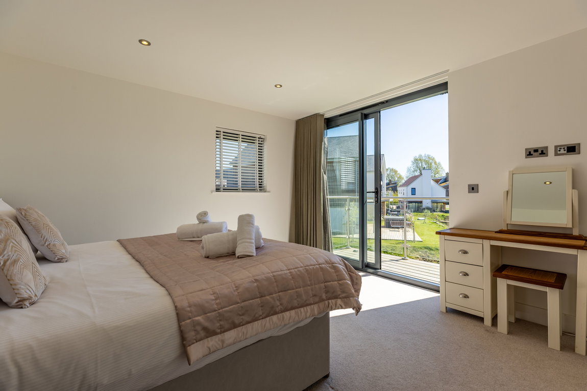 MASTER BEDROOM: A spacious principal bedroom enjoying stunning views across Minety Lake, with sliding glass doors opening onto a private sun deck - an ideal spot to relax and take in the surroundings. The room offers a calm and inviting feel, enhanced by the natural light and outlook.