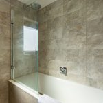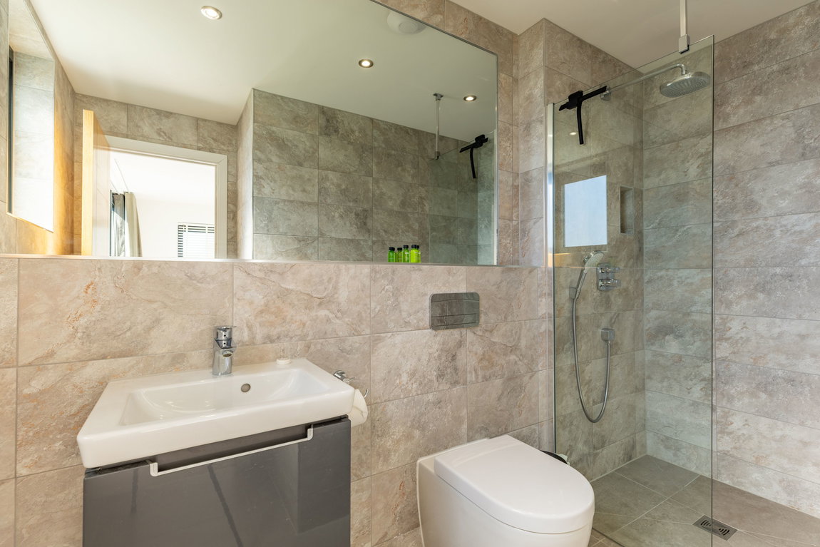 FAMILY SHOWER ROOM: A well-proportioned shower room comprising a shower cubicle, WC, wash hand basin and heated towel rail.