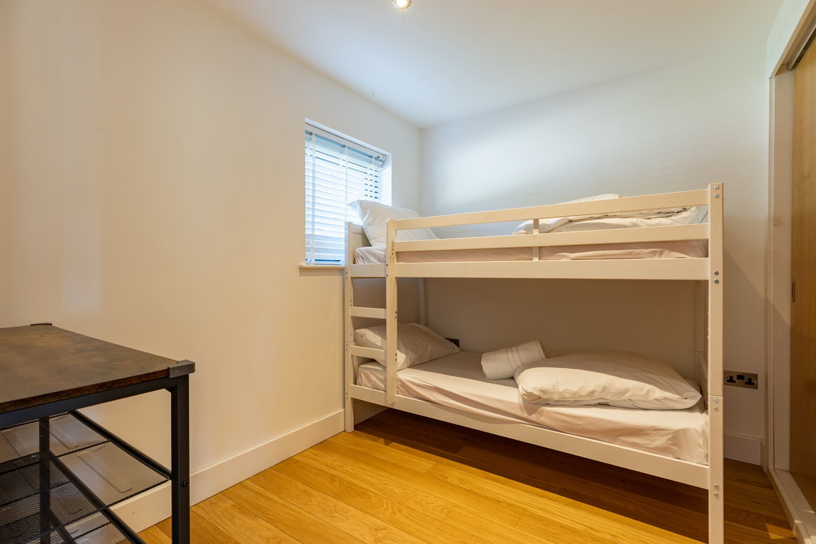 ACCOMODATION Ground Floor: Enter directly from the property’s private parking spaces, through a covered porch, into the entrance hall. Here, the family bathroom is on the right, while the fourth bedroom is on the left, currently arranged as a bunk room but spacious enough to accommodate a double bed.