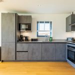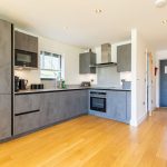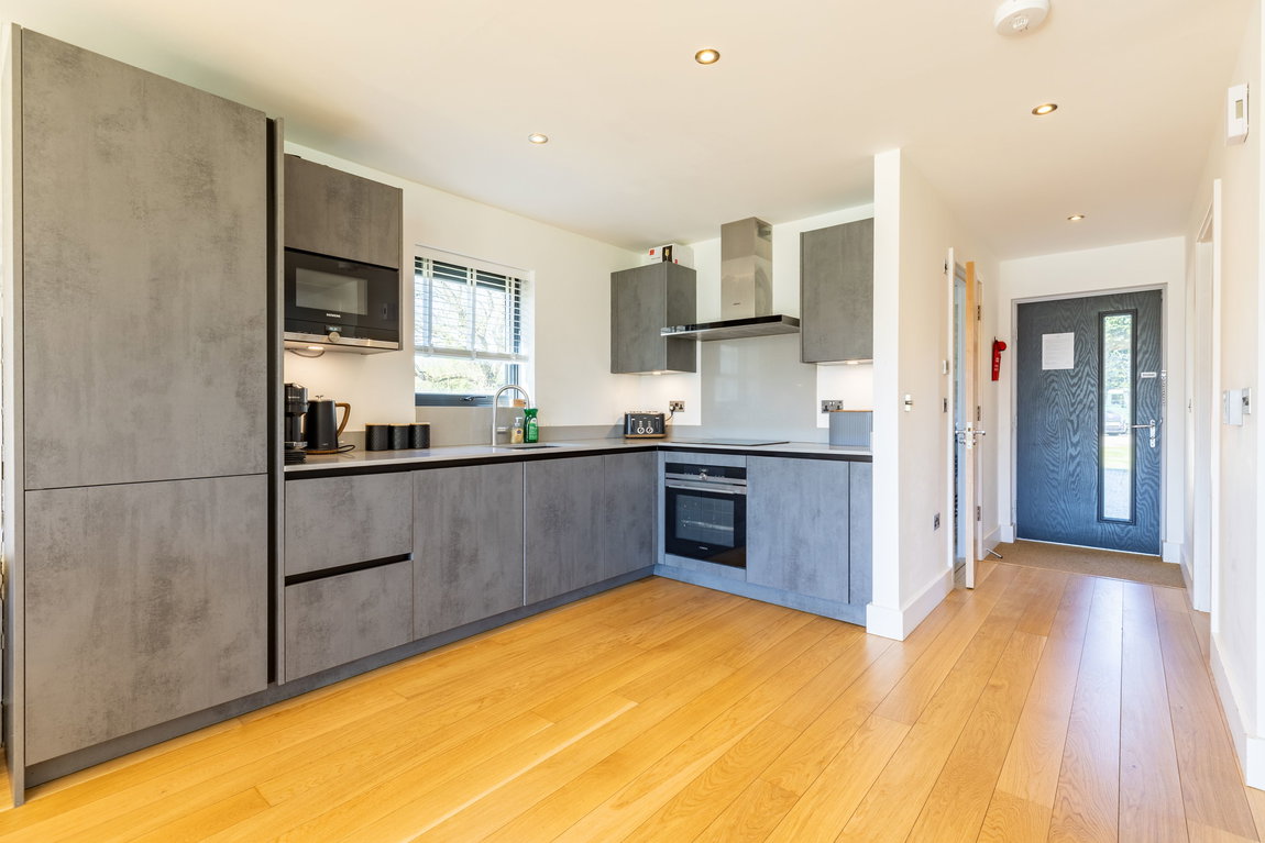 KITCHEN: As you move into the kitchen area, your eye is naturally drawn through towards the lake, with the abundance of light creating a bright and inviting atmosphere. The kitchen is beautifully styled, featuring contemporary stone-effect cabinetry paired with sleek granite worktops, giving a modern and high-quality finish.