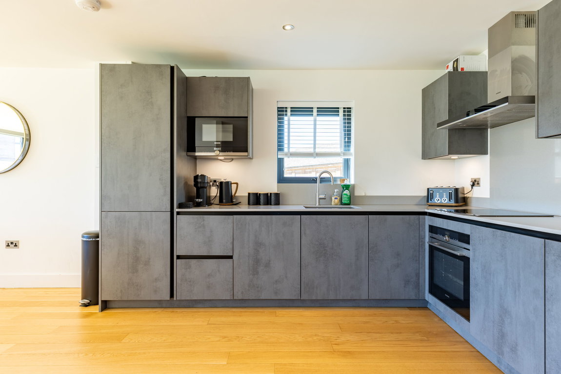 It is well-equipped with integrated Neff appliances, including an induction hob, oven, microwave and dishwasher, along with a mixer tap and full-height fridge/freezer, combining practicality with refined design.