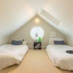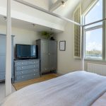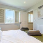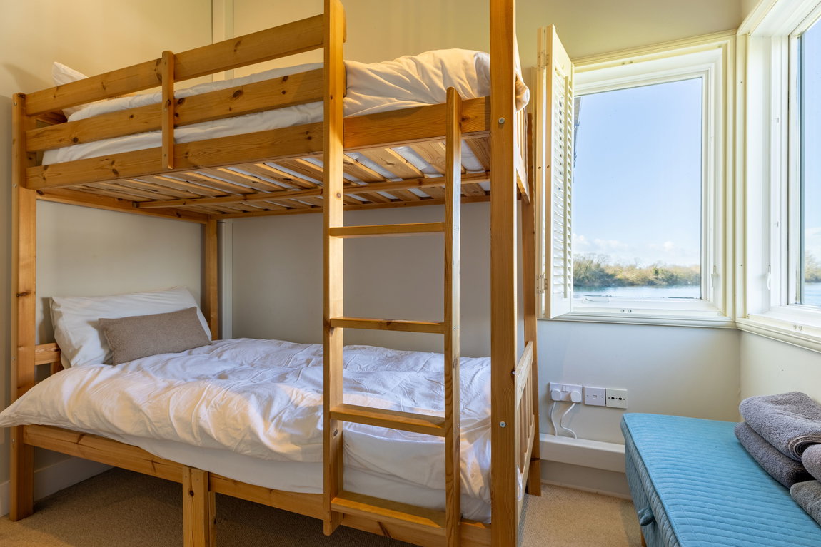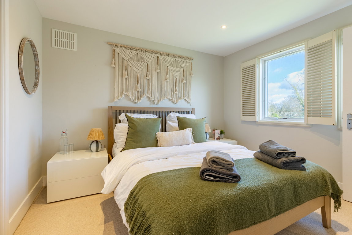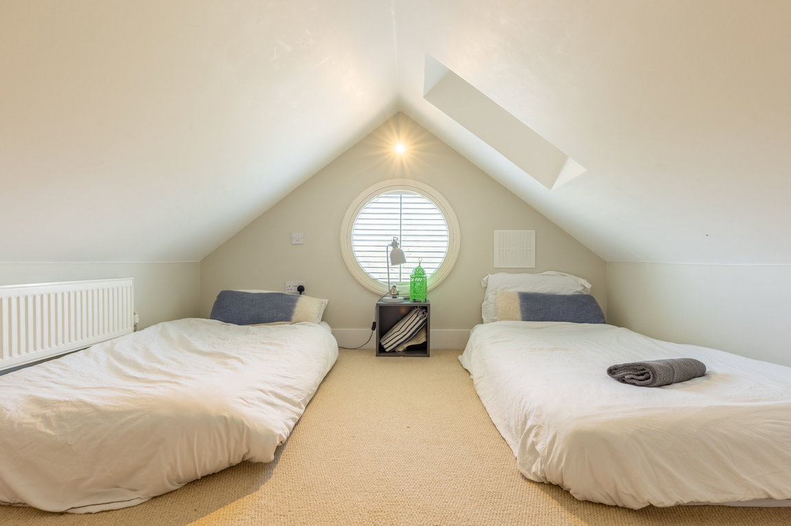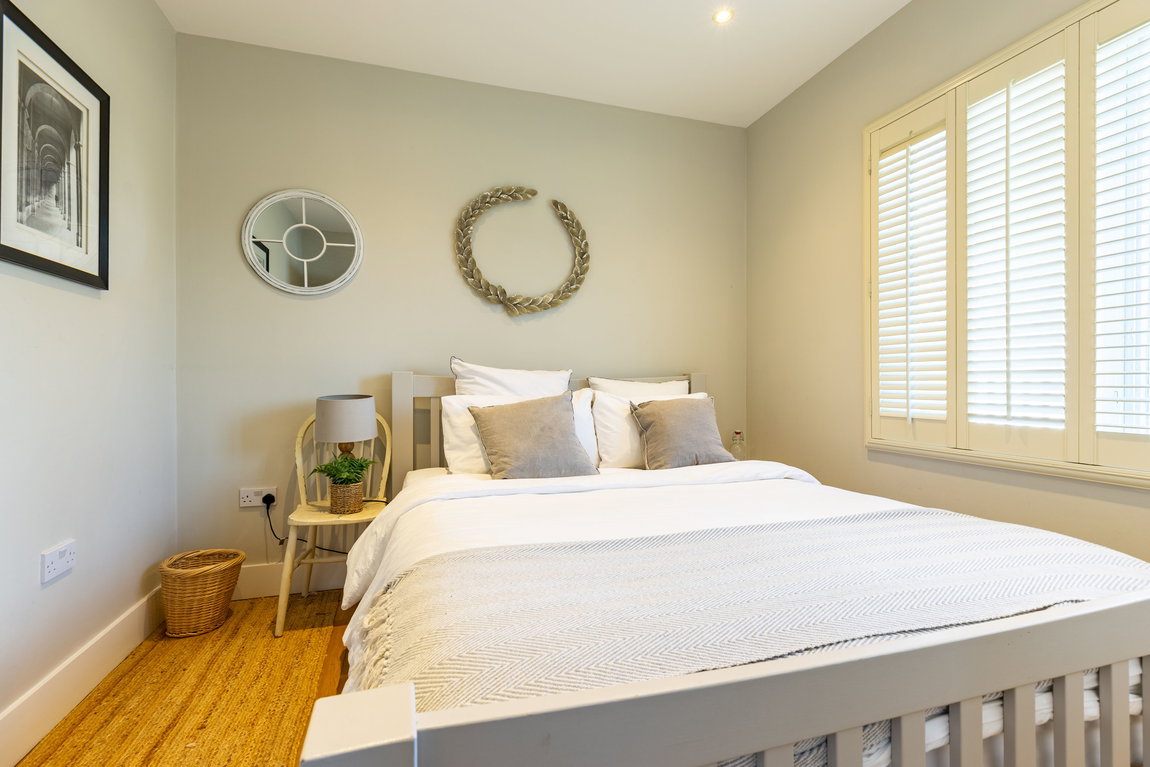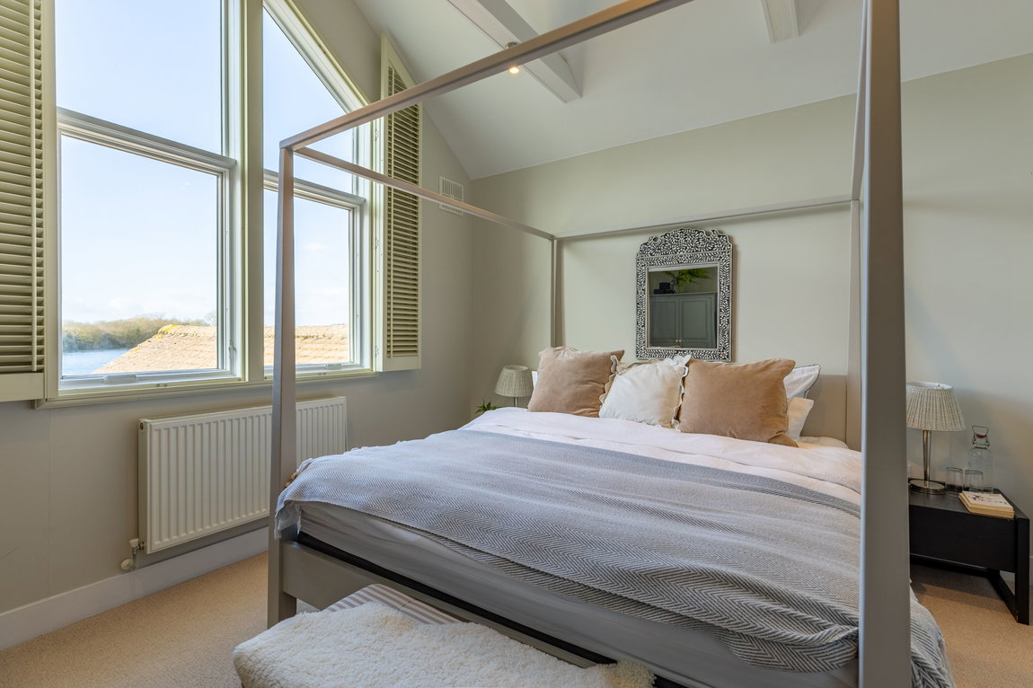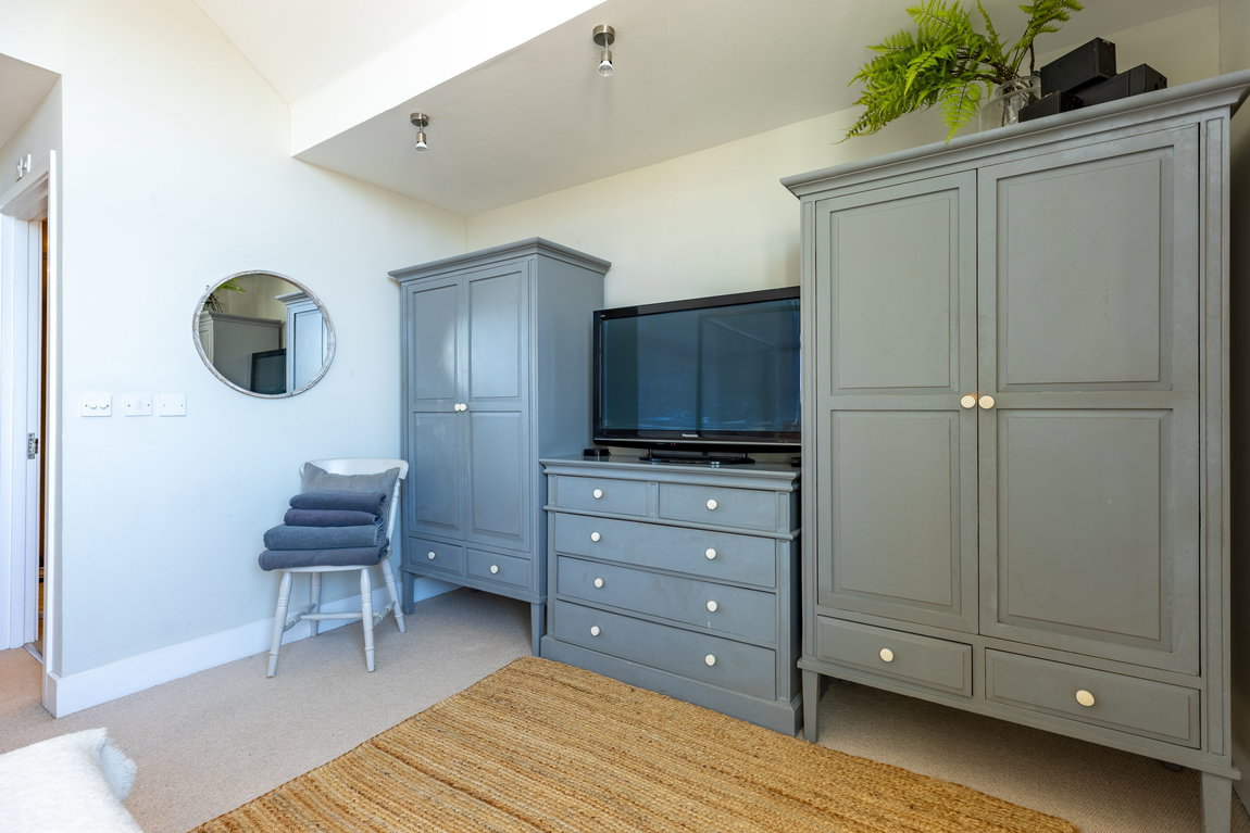 BEDROOM 2: A well-proportioned double bedroom with windows to both the front and side aspects, providing good natural light. The room benefits from a built-in wardrobe and access to the mezzanine level above, with the current layout well suited to holiday letting use.