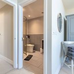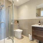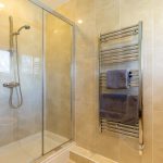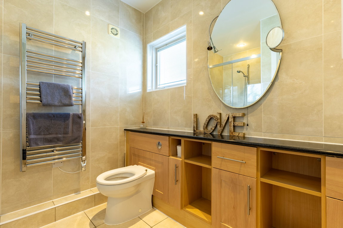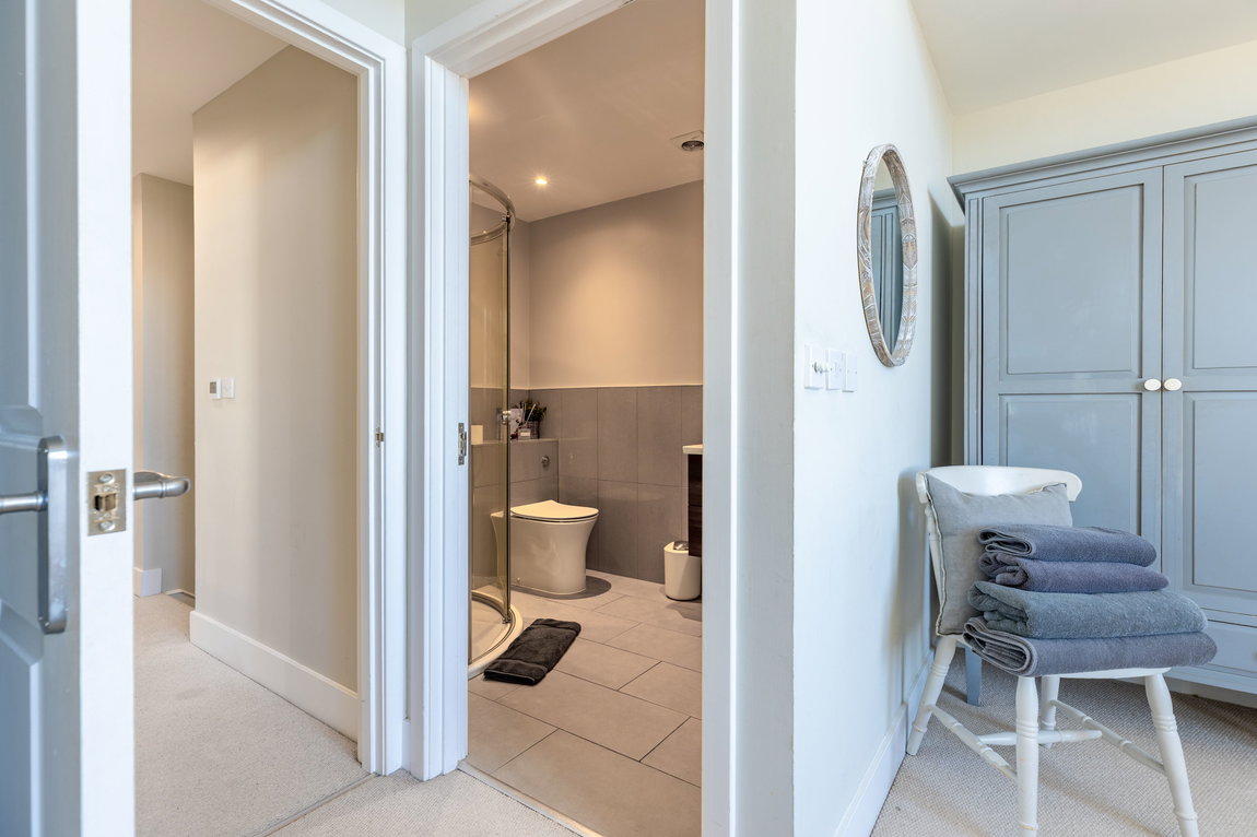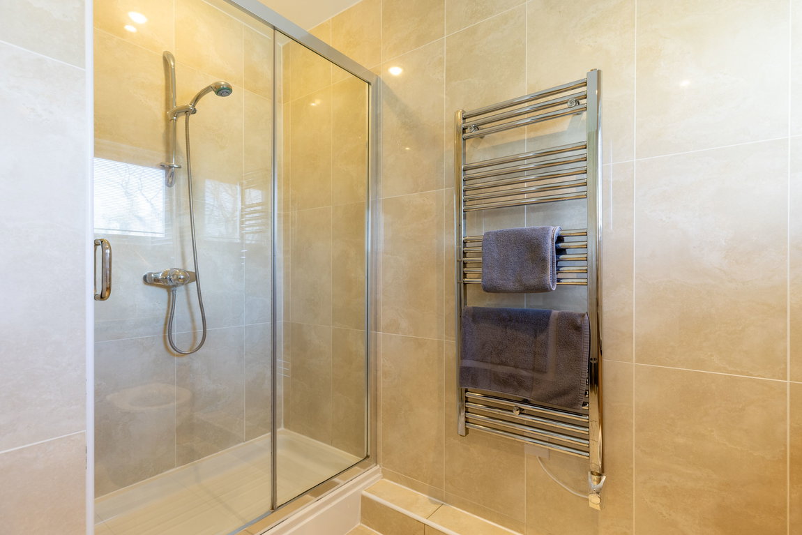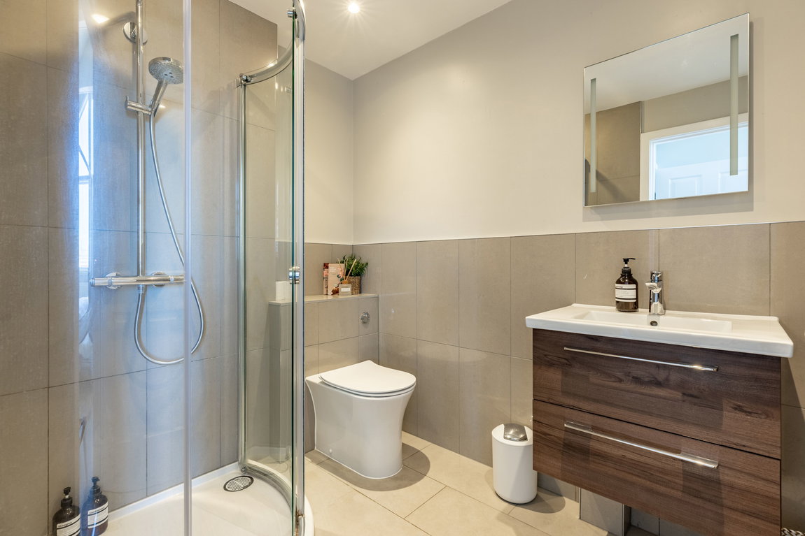 SHOWER ROOM: Positioned opposite the ground-floor bedroom, the shower room is fitted with a double shower enclosure, WC, and wash hand basin set within a vanity unit, along with a heated towel rail. Fully tiled walls and flooring are complemented by a front-facing window providing natural light and ventilation.