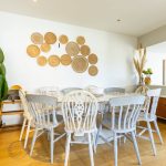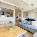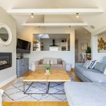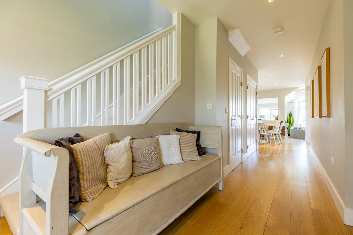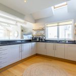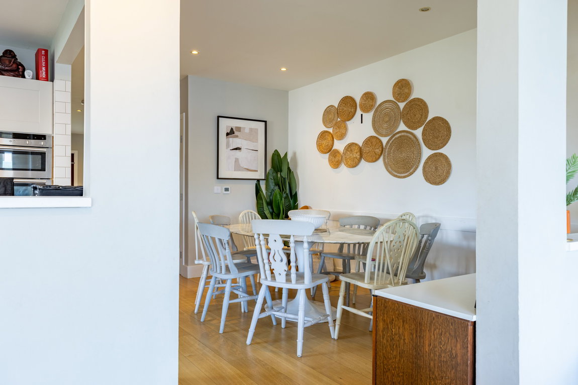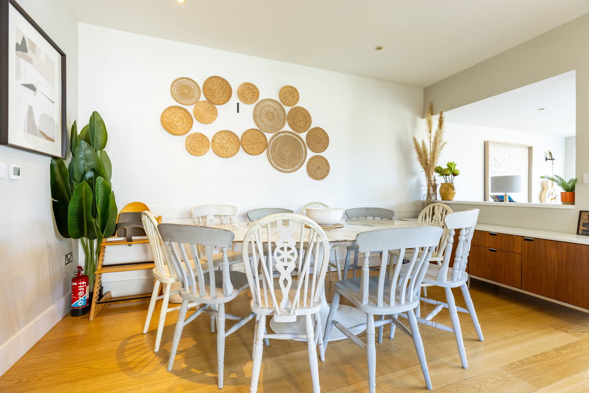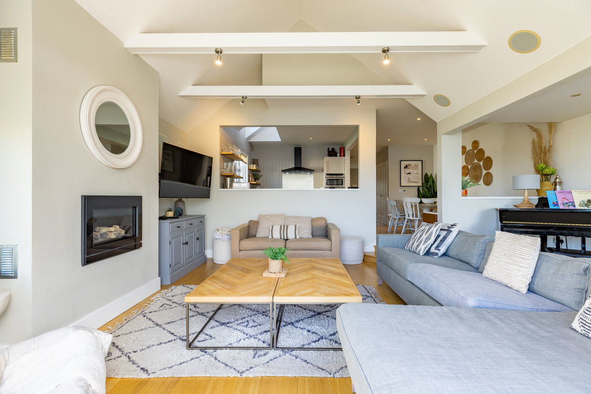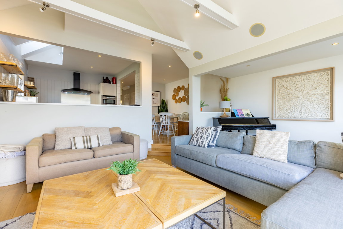 To the left of the kitchen is a flexible open area currently used as an informal seating and music space, but equally suitable for a larger dining arrangement.