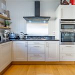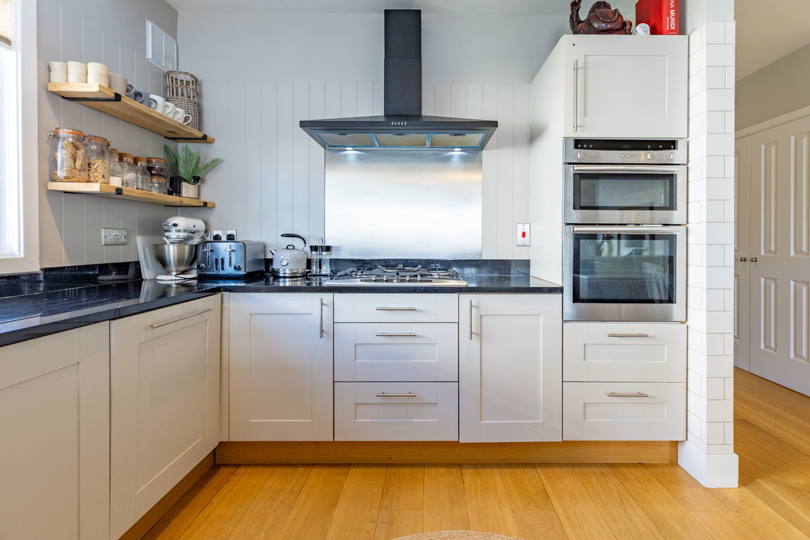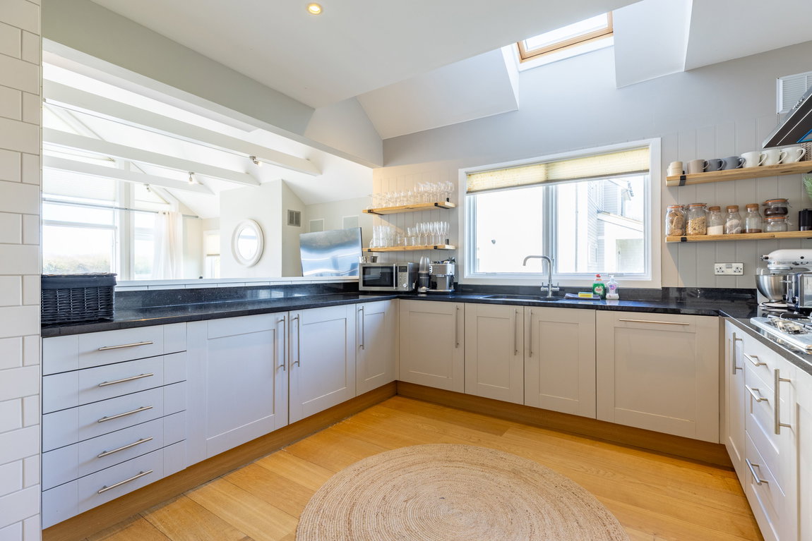 KITCHEN: The kitchen is seamlessly integrated within the open-plan layout and is well appointed with dark granite worktops, shaker-style cabinetry and a range of integrated Neff appliances, including a double oven, fridge/freezer and dishwasher. A 1½ bowl sink with mixer tap is positioned to look through the living space and out towards the view beyond. Oak flooring continues through from the main living area, maintaining a consistent finish.