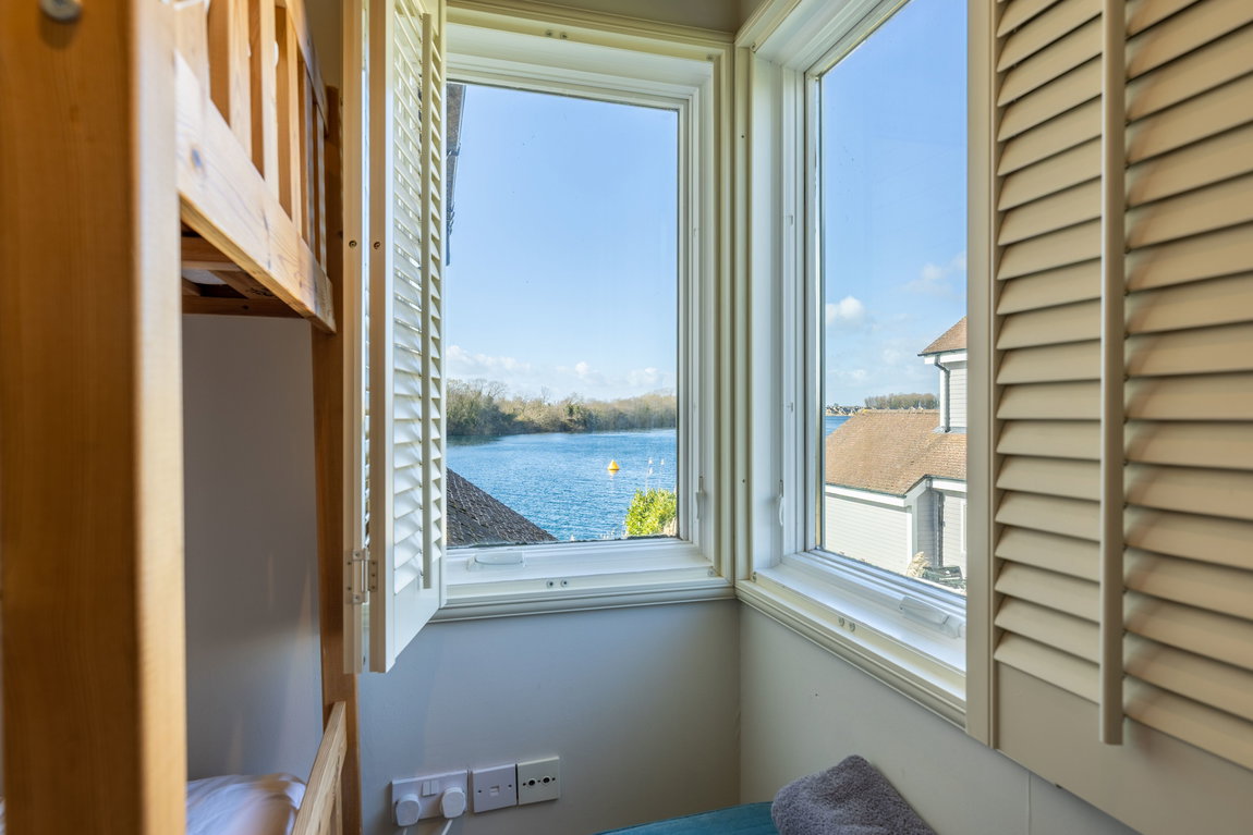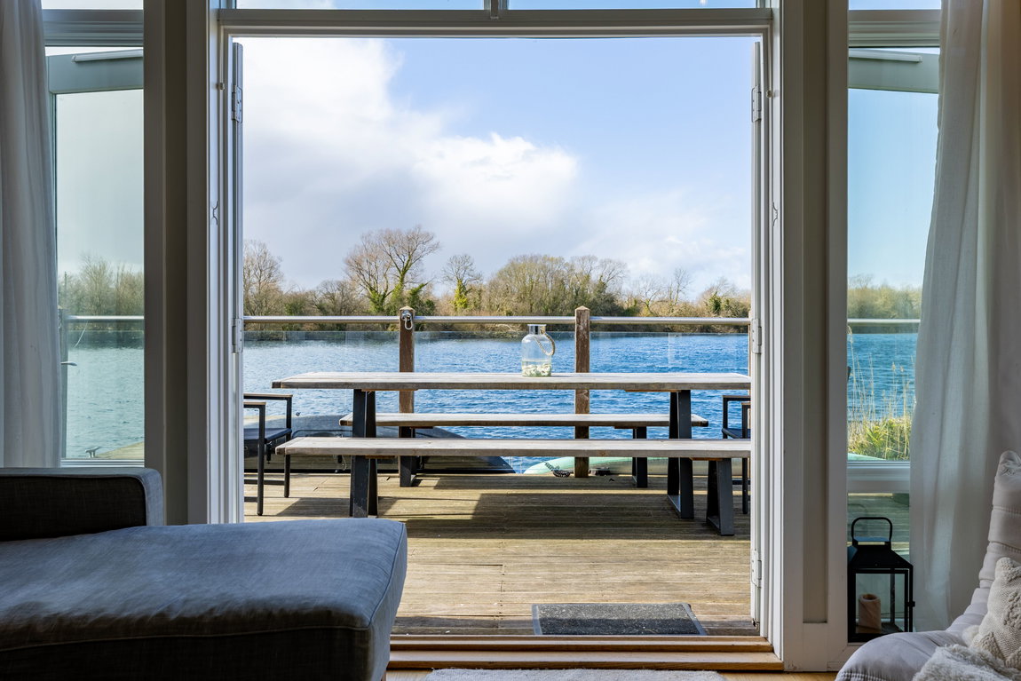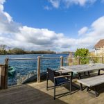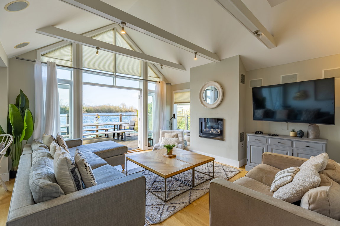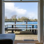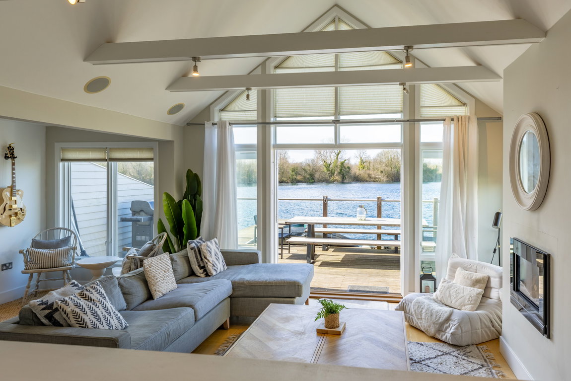 MAIN LIVING AREA: The open-plan living and dining space has been thoughtfully arranged to take full advantage of the extensive glazing and far-reaching outlook. A pair of large glazed doors, flanked by full-height panels and topped with an apex window, draw in excellent natural light and open directly onto the rear deck and shared pontoon. Oak flooring extends throughout, creating a warm and cohesive space with ample room for both seating and dining.