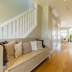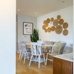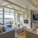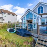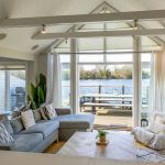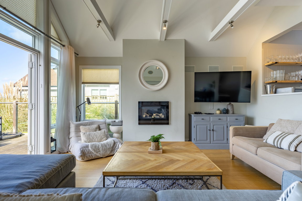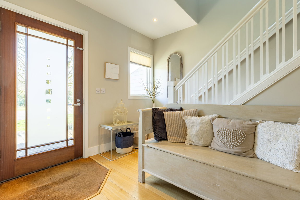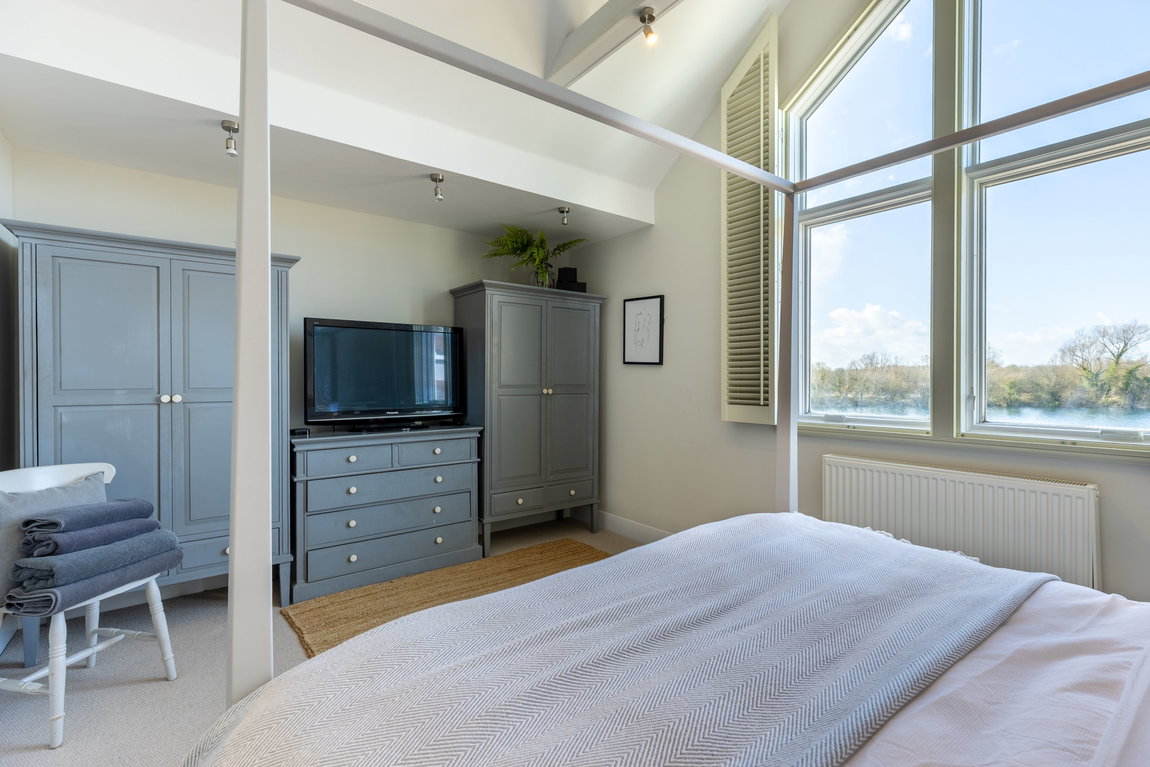 MAIN LIVING AREA: The open-plan living and dining space has been thoughtfully arranged to take full advantage of the extensive glazing and far-reaching outlook. A pair of large glazed doors, flanked by full-height panels and topped with an apex window, draw in excellent natural light and open directly onto the rear deck and shared pontoon. Oak flooring extends throughout, creating a warm and cohesive space with ample room for both seating and dining.
