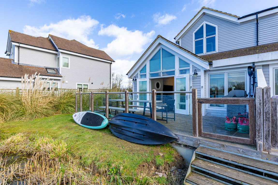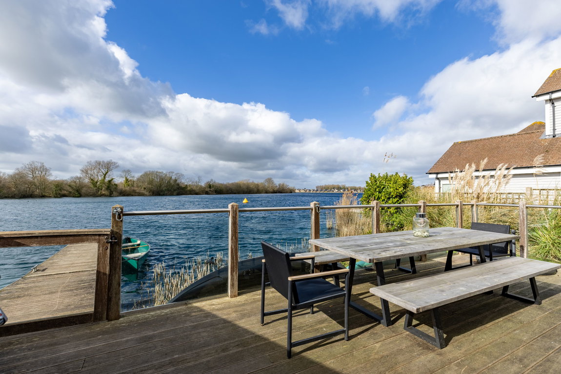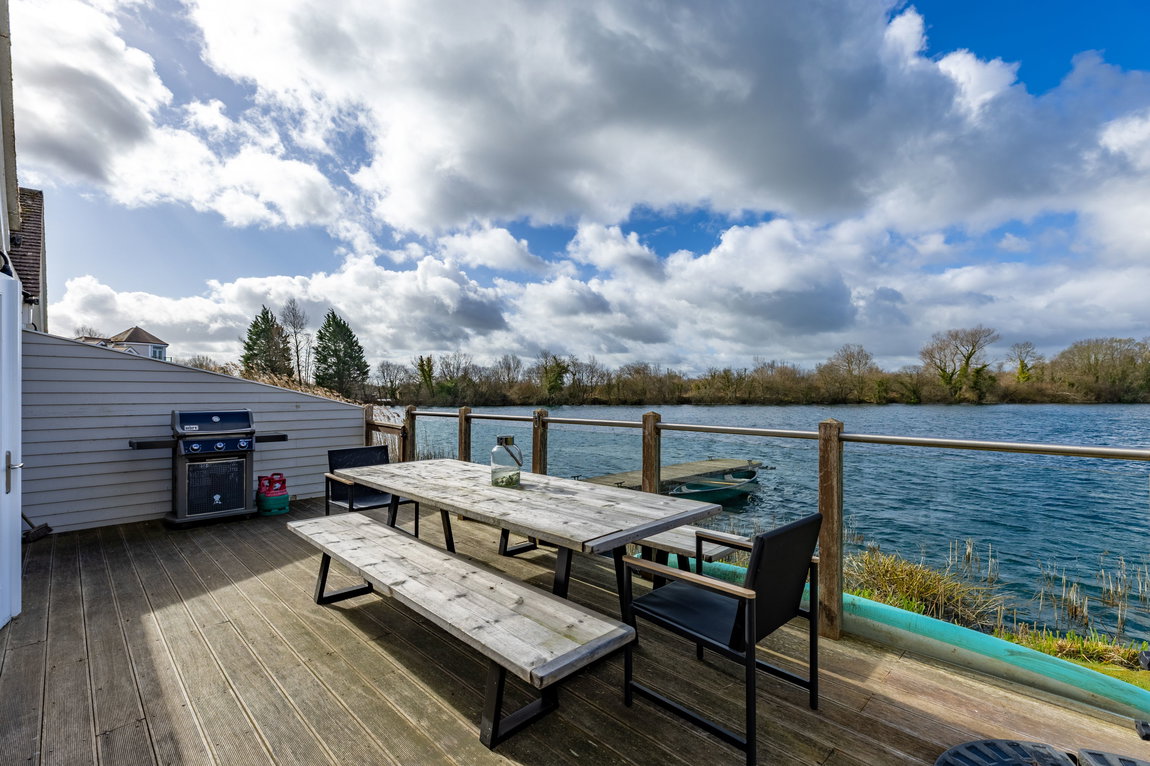 OUTSIDE: A south-facing deck extends across the rear and side of the property, making the most of the open lake aspect. The space provides ample room for outdoor dining and seating, with direct access to the shared jetty, ideal for paddleboarding and other non-motorised water activities.