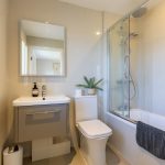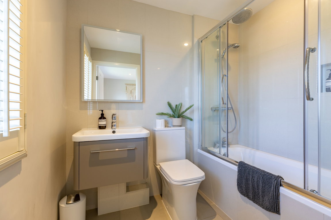 FAMILY BATHROOM: A fully tiled bathroom fitted with a modern white suite, comprising a bath with glass shower screen and overhead shower, WC, and wash hand basin set within a wooden vanity unit. A side-facing window provides natural light and ventilation.