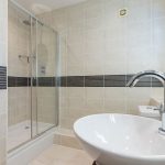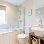 FAMILY BATHROOM: A fully tiled bathroom fitted with a white three-piece suite comprising bath with glass shower screen and overhead shower, WC, and wash hand basin set within a wooden vanity unit. A side window provides natural light and ventilation.