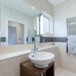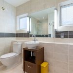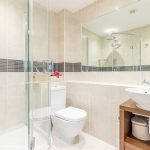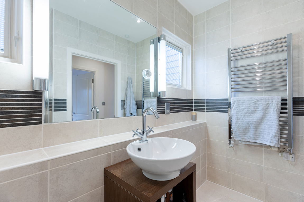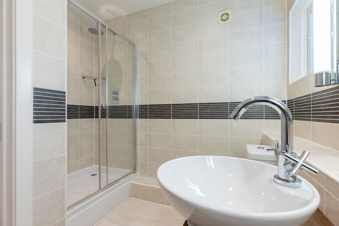 SHOWER ROOM: Situated opposite the ground-floor bedroom, the shower room comprises a double shower tray, WC, wash hand basin with vanity unit, and a heated towel rail. Fully tiled walls and flooring are complemented by a window to the front providing natural light and ventilation.