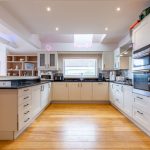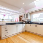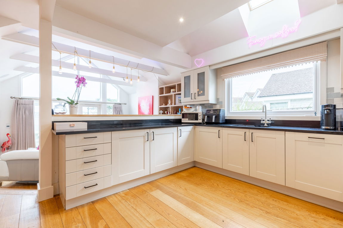 KITCHEN: The kitchen forms part of the open-plan layout and is fitted with dark granite worktops, shaker-style units and a range of integrated Neff appliances, including a double oven, fridge/freezer and dishwasher. A 1½ bowl sink with mixer tap is positioned to overlook the living space and beyond. Oak flooring continues throughout.