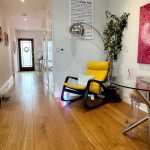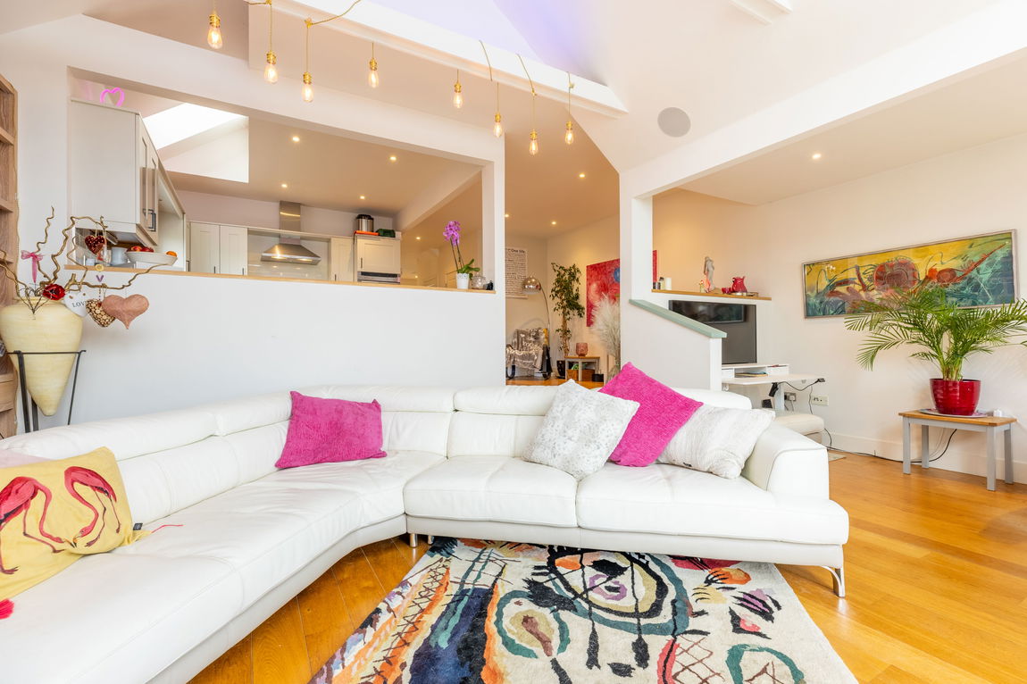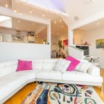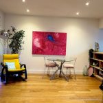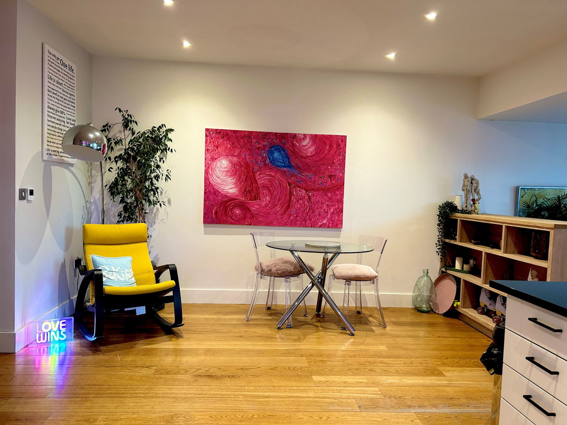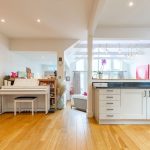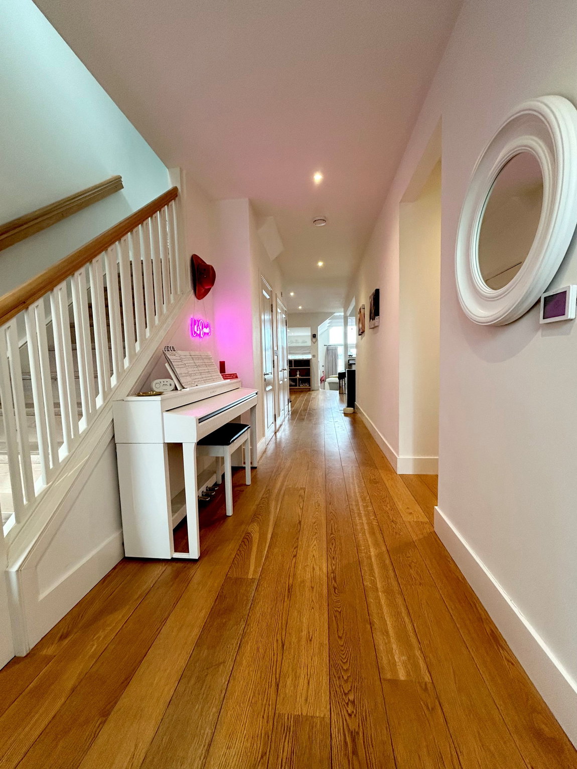 To the left of the kitchen is a flexible open area currently used as an informal seating and music space, but equally suitable for a larger dining arrangement.