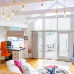 The vaulted open-plan living area is flooded with natural light via full-height glazing and a striking apex window, seamlessly connecting indoor and outdoor living. The contemporary kitchen features granite worktops and integrated Neff appliances, with dining space flowing naturally from the main reception area. The ground floor has underfloor heating throughout.