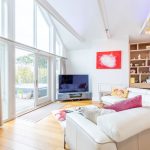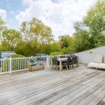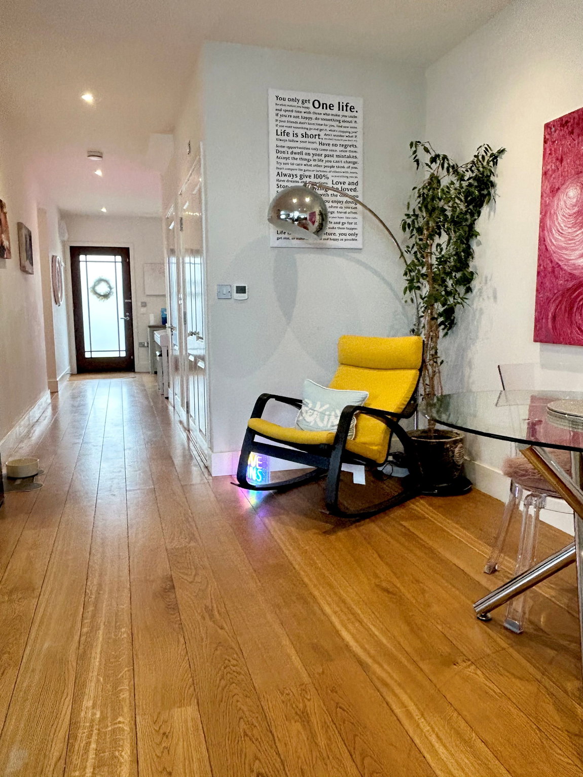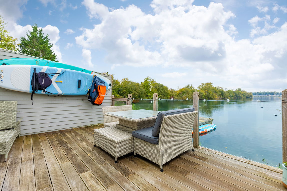 MAIN LIVING AREA: The open-plan living and dining area is arranged to make full use of the previously mentioned glazing and outlook. Two large glazed doors with full-height sidelights and an apex window above provide natural light throughout and open directly onto the rear deck and shared pontoon. Oak flooring runs throughout this space, which comfortably accommodates seating and dining areas.