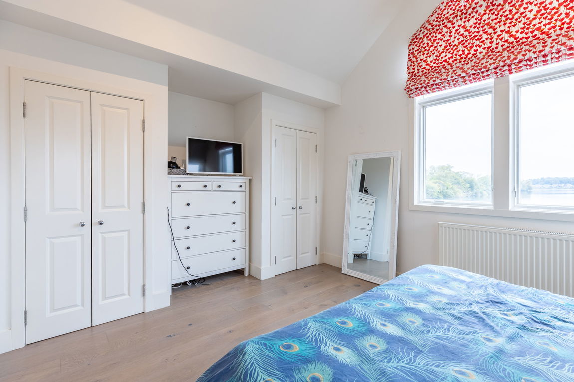 MASTER BEDROOM: A spacious double bedroom positioned to take advantage of the elevated lake outlook, with large windows framing the view. The room includes two fitted wardrobes and a modern en-suite shower room with corner shower cubicle, wash hand basin, WC and heated towel rail.
