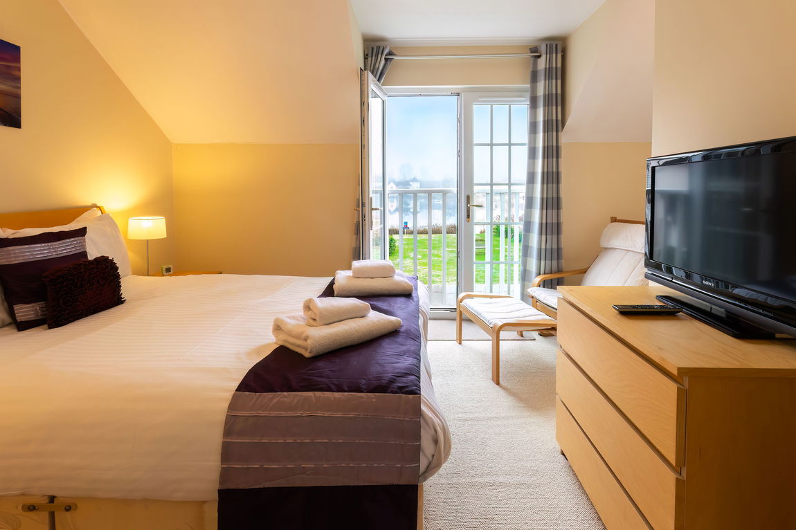 MASTER BEDROOM: A good sized master bedroom offering extensive lake views from its Juliet balcony with fully opening double glass doors to allow the sounds of the wildlife and fresh air in. Access to en-suite which has new flooring. Large built in wardrobes.