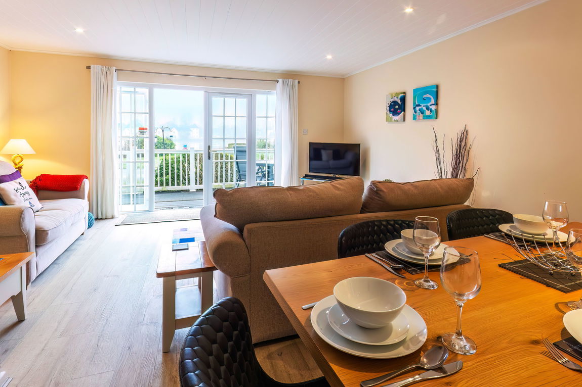 OUTSIDE: A large sun deck extends across the front of the property and gives breathtaking views over the lake. This area is great for entertaining. BBQ to be included in sale if you wish. Access to communal gardens. Ample parking at the end of the path leading to the front door.